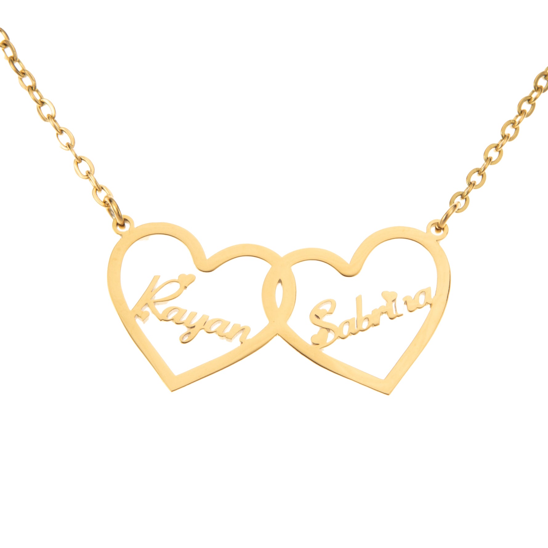 Introducing our stunning intertwined hearts necklace, a true symbol of love and connection. Crafted from high-quality stainless-steel, this necklace features two heart-shaped pendants, delicately intertwined with each other, representing the unbreakable bond between two people. Inside each heart, you can customize with a special name or message, making this piece of jewelry truly unique and personal.