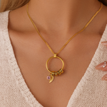 Designed with a timeless open circle to symbolize eternity and connection, this elegant piece is personalized with engraved name charms and a sparkling gemstone of your choice. The delicate leaf detail represents renewal, strength, and the beauty of family bonds — making this necklace more than jewelry, but a meaningful keepsake.