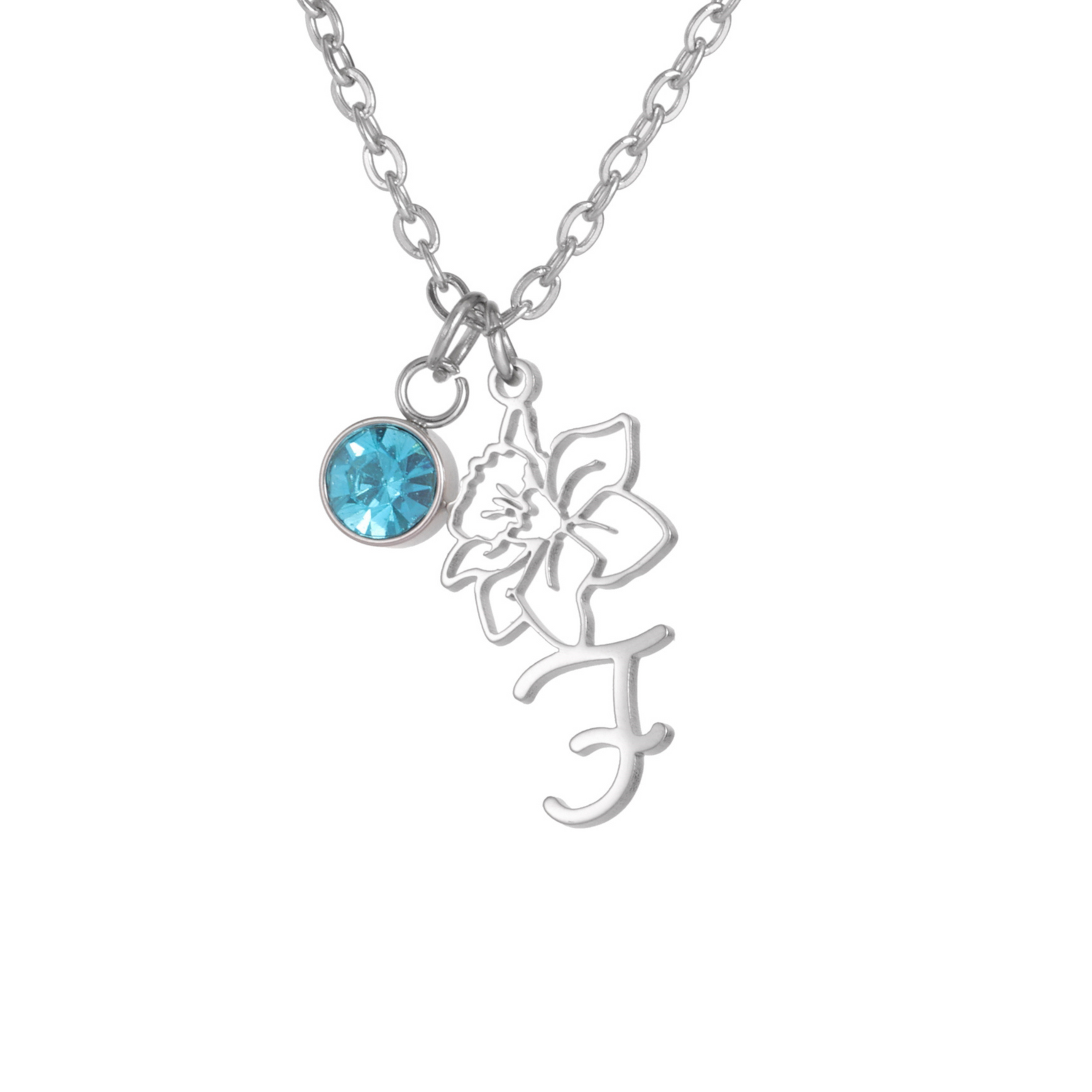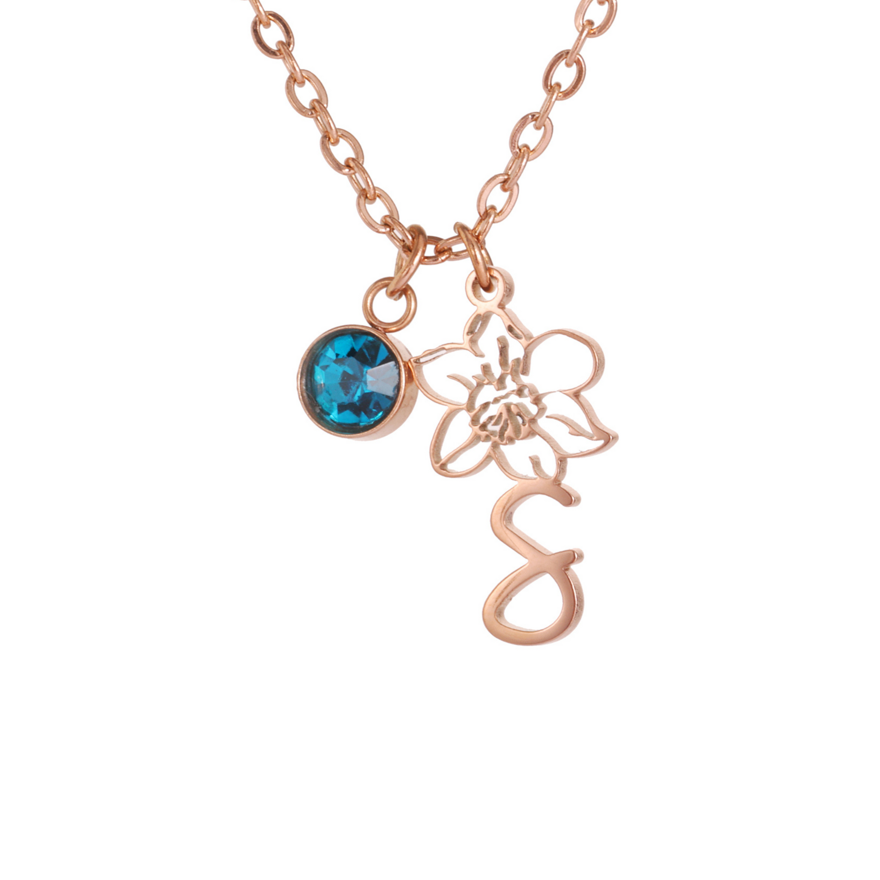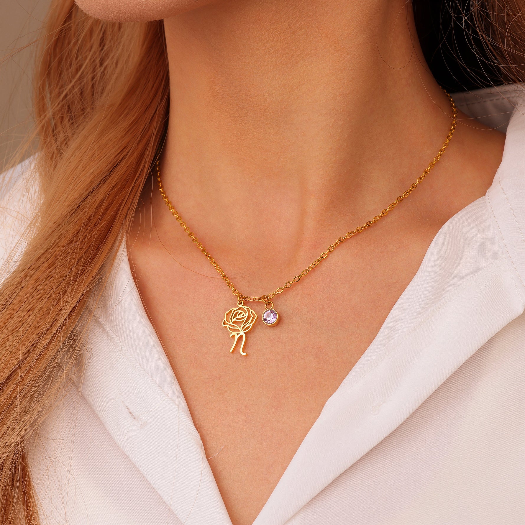 Express your individuality with this delicately engraved necklace featuring an elegant flower and your initial alongside a sparkling birthstone. This unique piece of jewelry is perfect for celebrating a loved one or gifting yourself a precious keepsake. The pendant is made of stainless steel, then plated in silver, gold, or rose gold, for a look that suits every style. The birthstone sparkles, adding a touch of color and meaning. Personalize this necklace by selecting the initial and birthstone that hold special meaning to you.