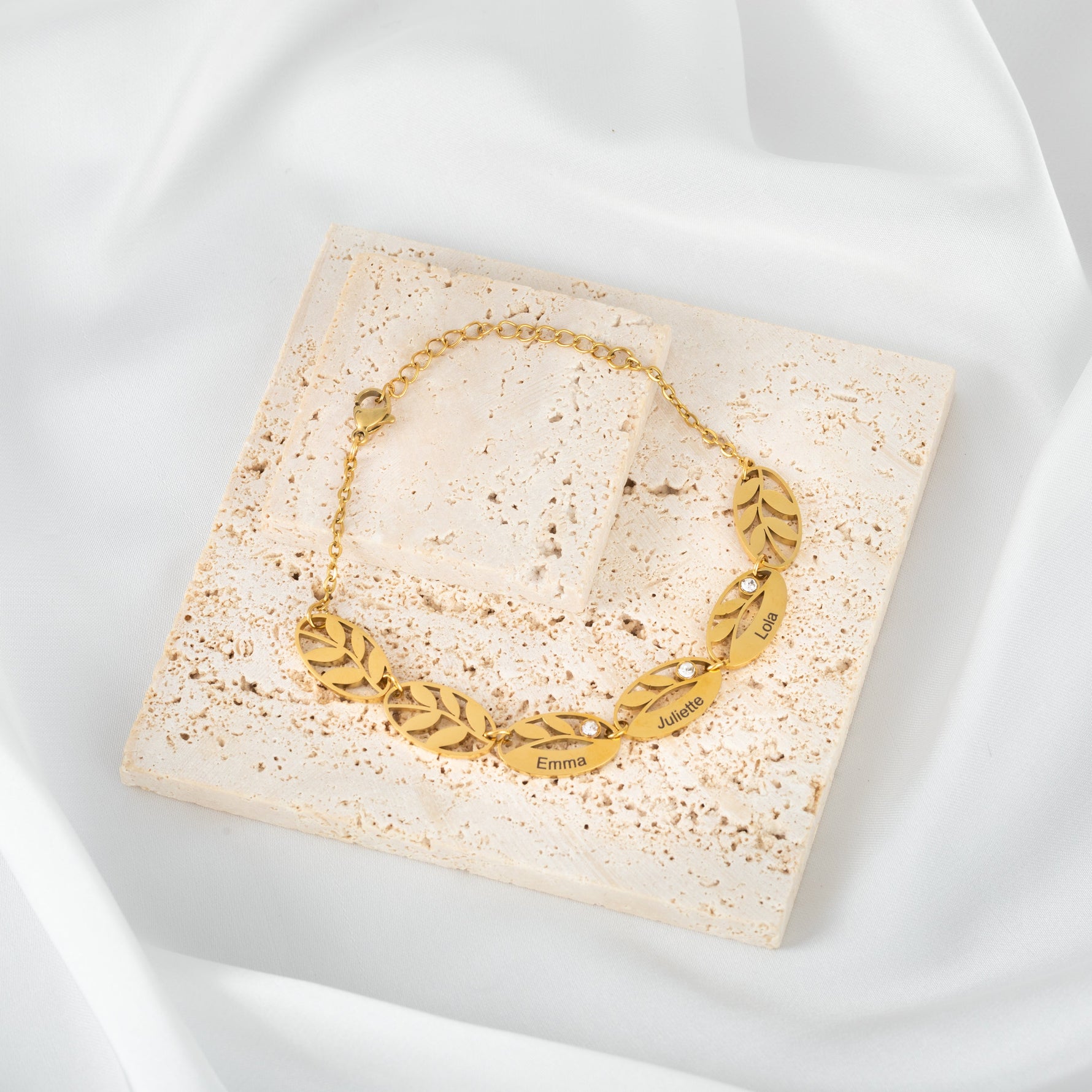 This exquisite bracelet allows you to personalize up to six leaves with names, meaningful words, or special inscriptions. Every leaf is meticulously crafted to create a jewelry piece that tells your story, your family, or your friendships in a unique and elegant way.