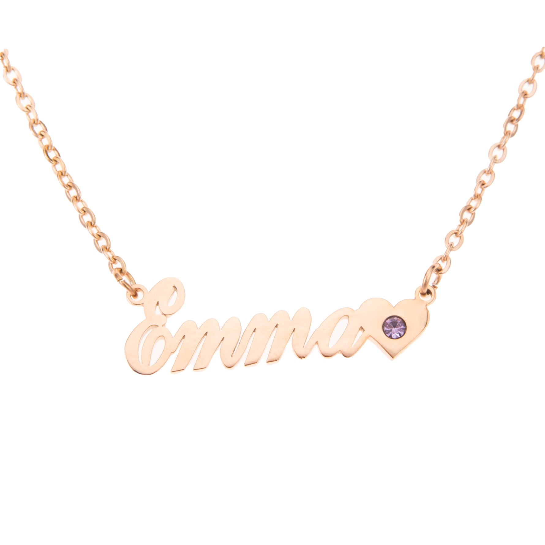 Crafted with care and attention to detail, this stunning necklace features a slightly slanted text of your choosing, ending with an intricately engraved heart. Set in the center of the heart is a beautiful birthday stone, adding a touch of color and personal significance to the piece.