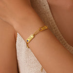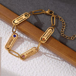Its sleek chain links and shimmering stones make it a statement of both style and sentiment. Perfect alone or layered with other bracelets for a modern, chic look.