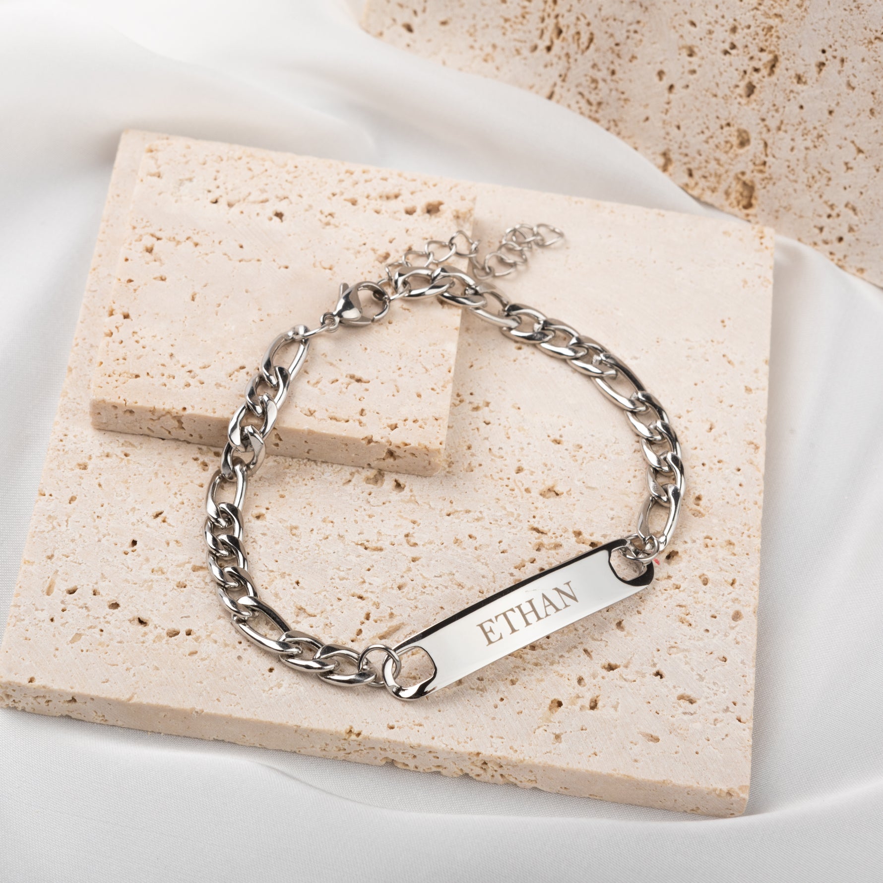 On top of looking incredibly stylish, our brand new bracelet for men will be perfect as an everyday accessory! Add his name, a date, or anything that means a lot to him. Our strong chain, closing with a clasp, will be comfortable and secure.