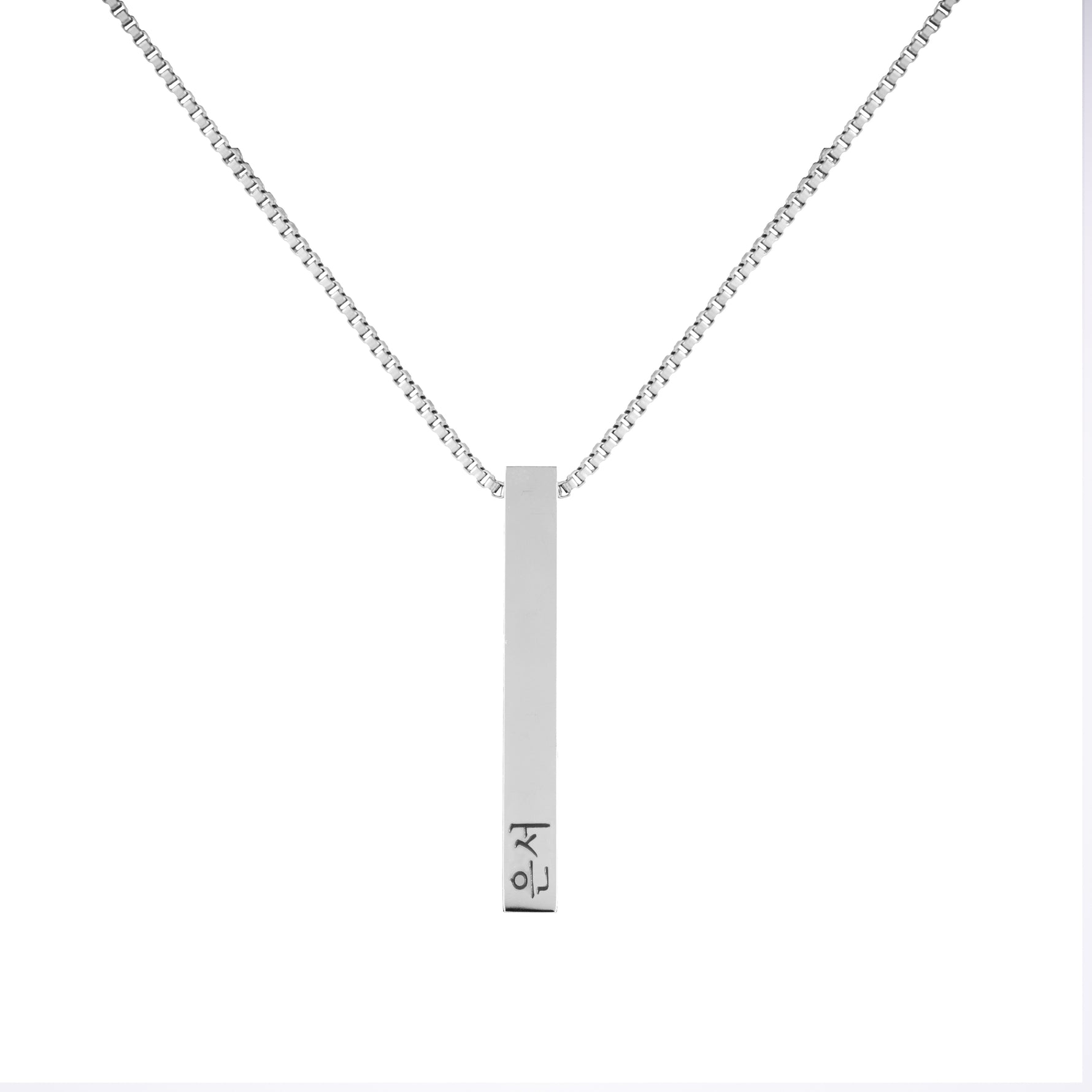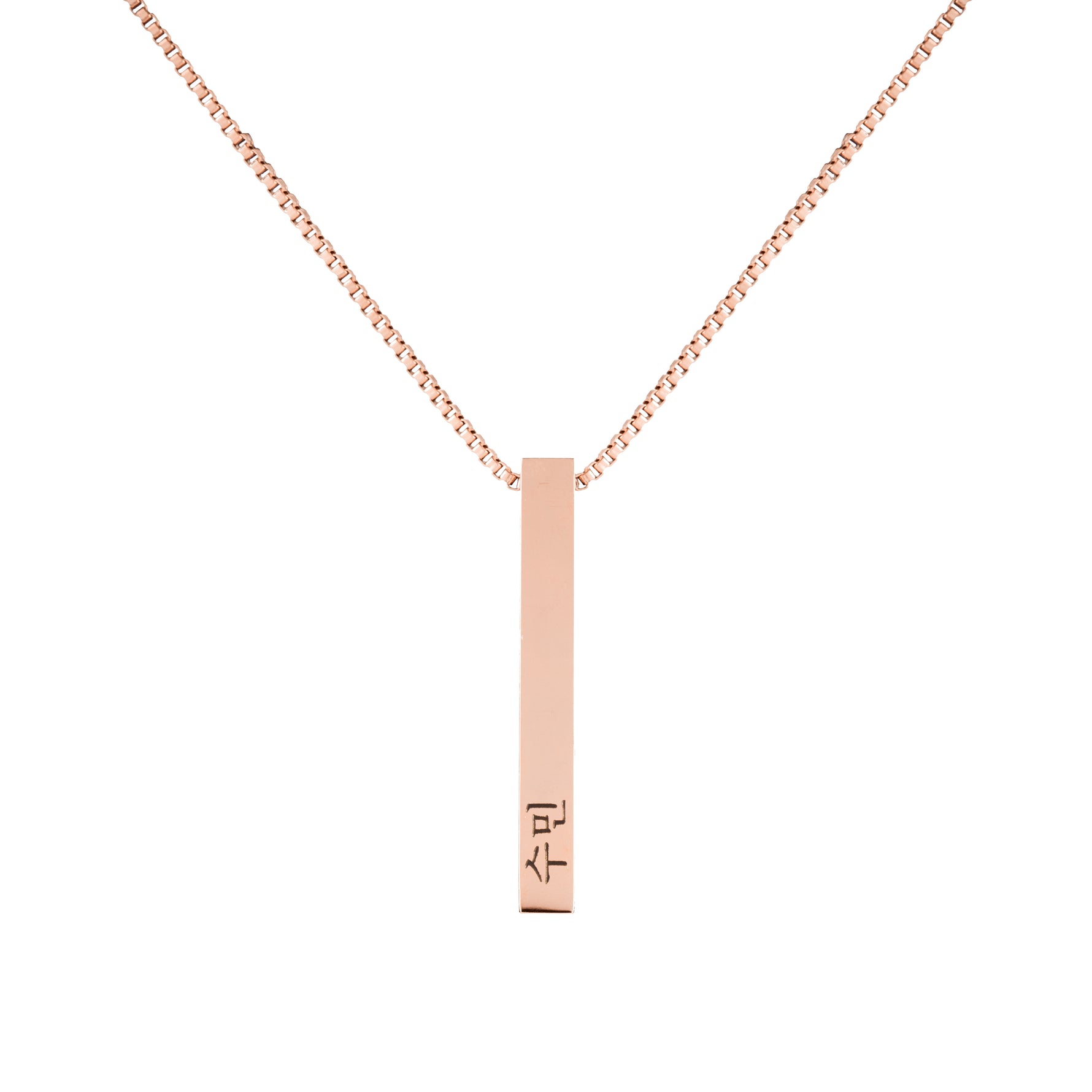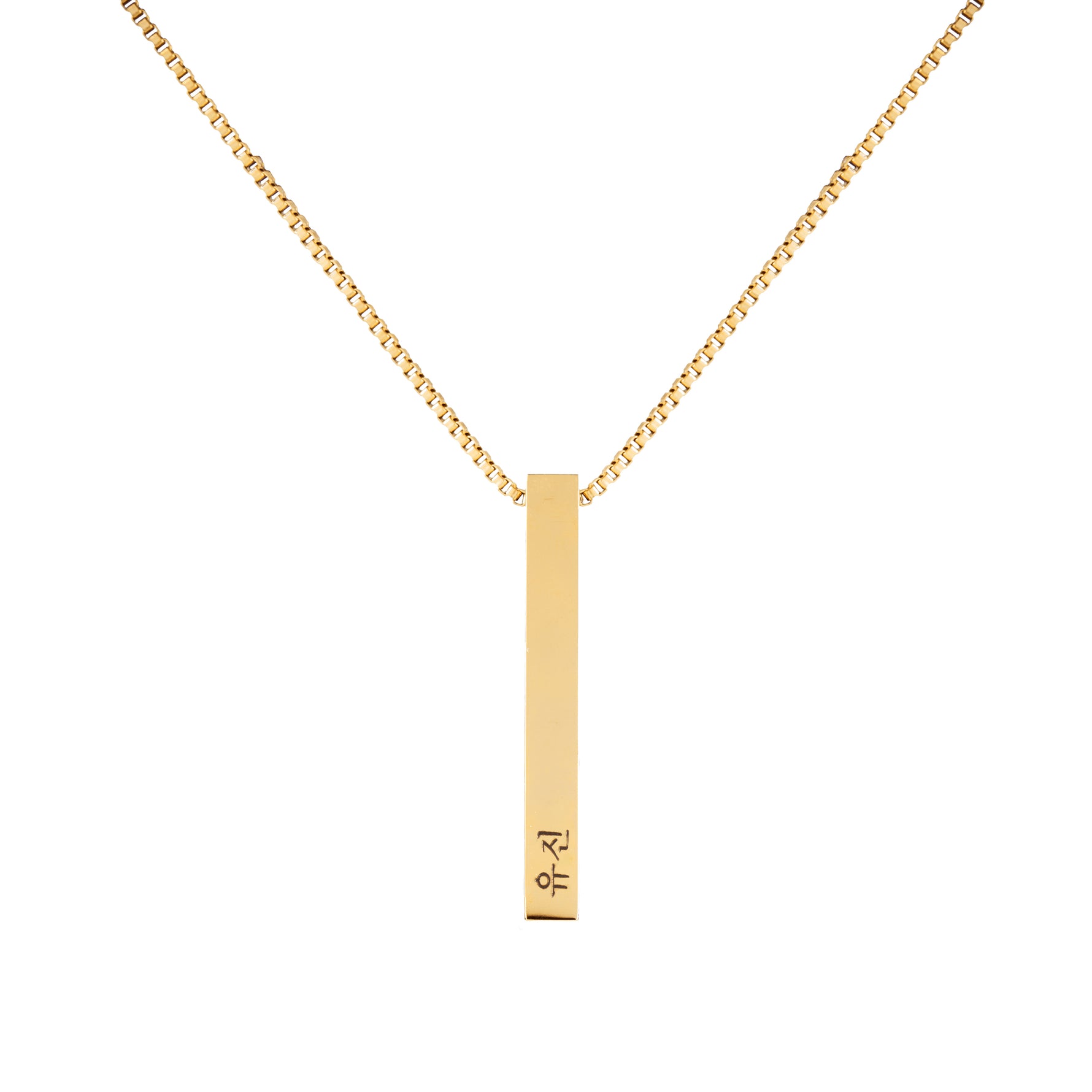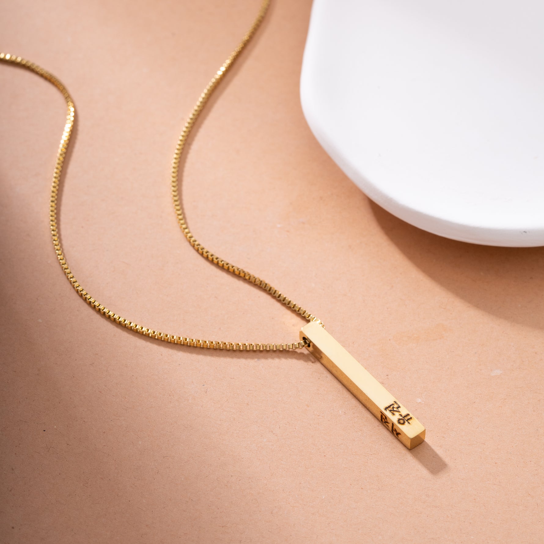 Discover our personalized 3D Bar necklace in Korean, modern and personal. Engrave a name, date or quote on its four sides, keeping your loved ones and memories close to your heart ❤️. Available in gold, silver and rose gold finishes, it is handmade with love in our workshops.