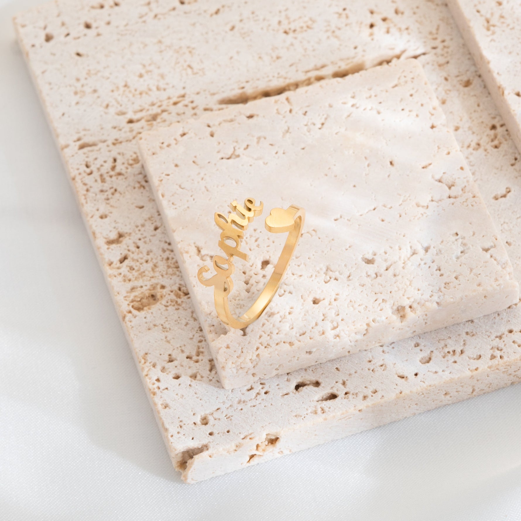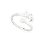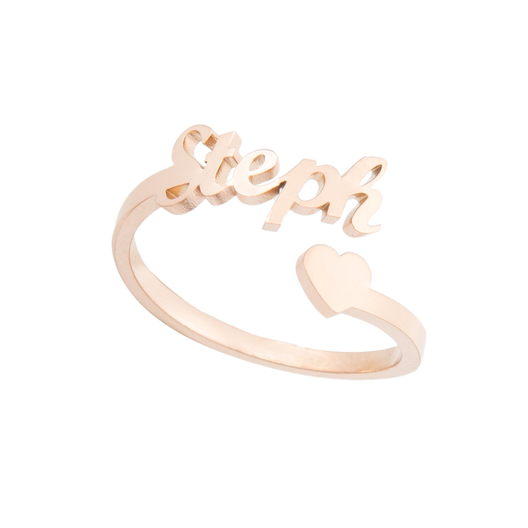 Offer a unique and personalized piece of jewelry with our open-ended ring in gold, silver, or rose gold finish. Personalize it with the name, word, or date of your choice to create a custom piece of jewelry. The ring is open-ended to fit all finger sizes and features a small heart cutout at the end of the metal, adding a touch of love to this unique piece.