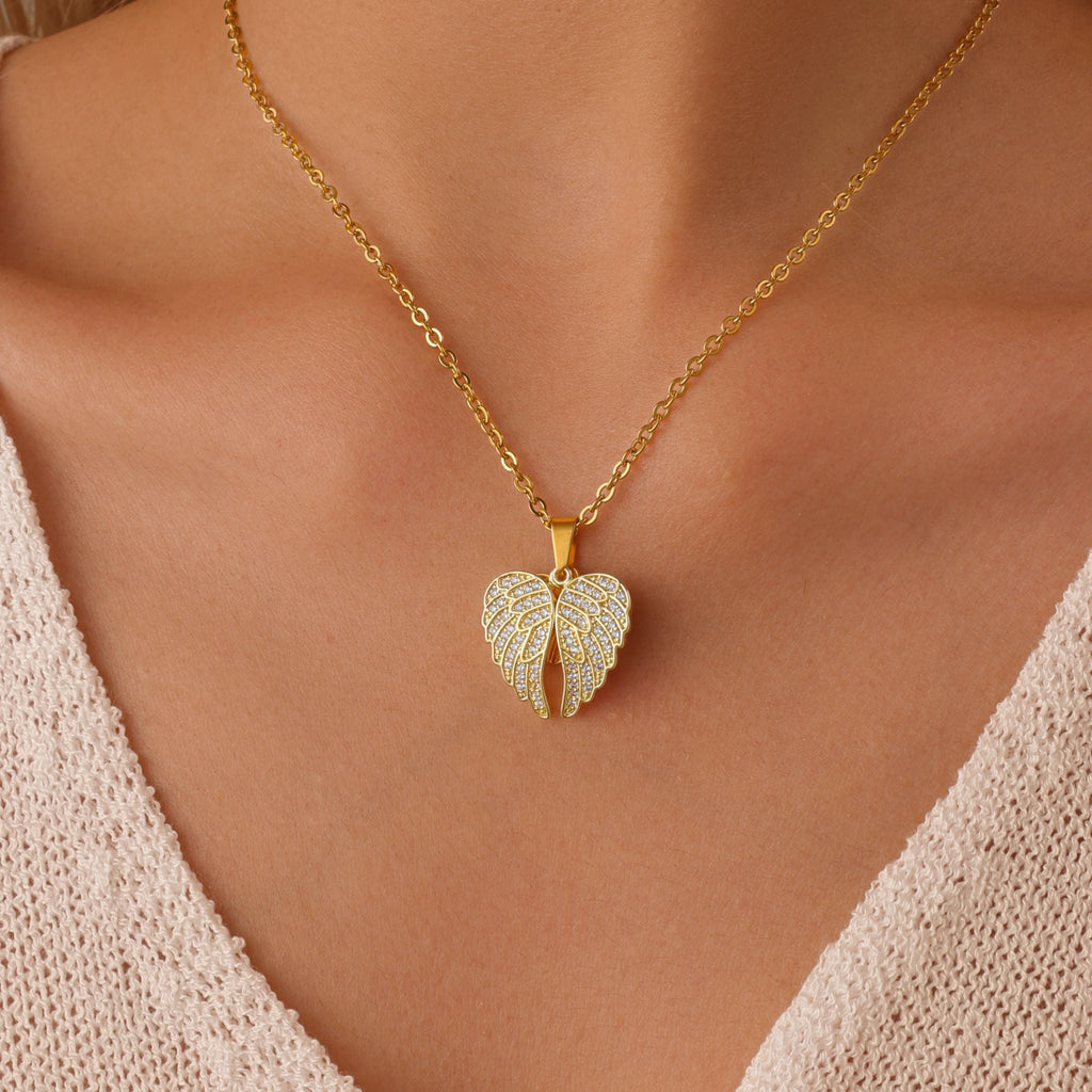 The sparkling wings and polished chain create a graceful look that shines in gold, rose gold, or silver. A versatile piece that complements both everyday wear and special occasions.