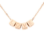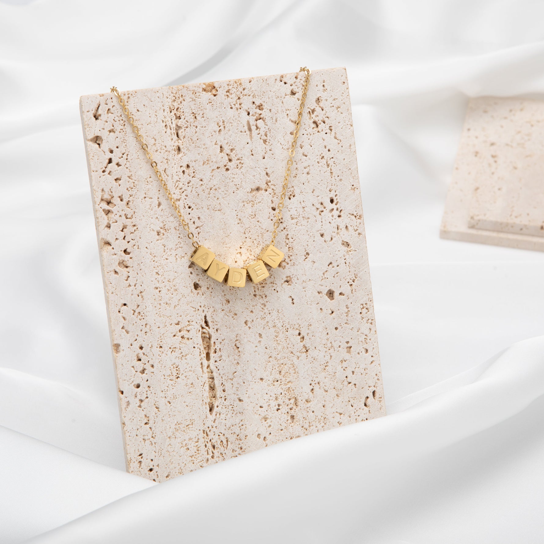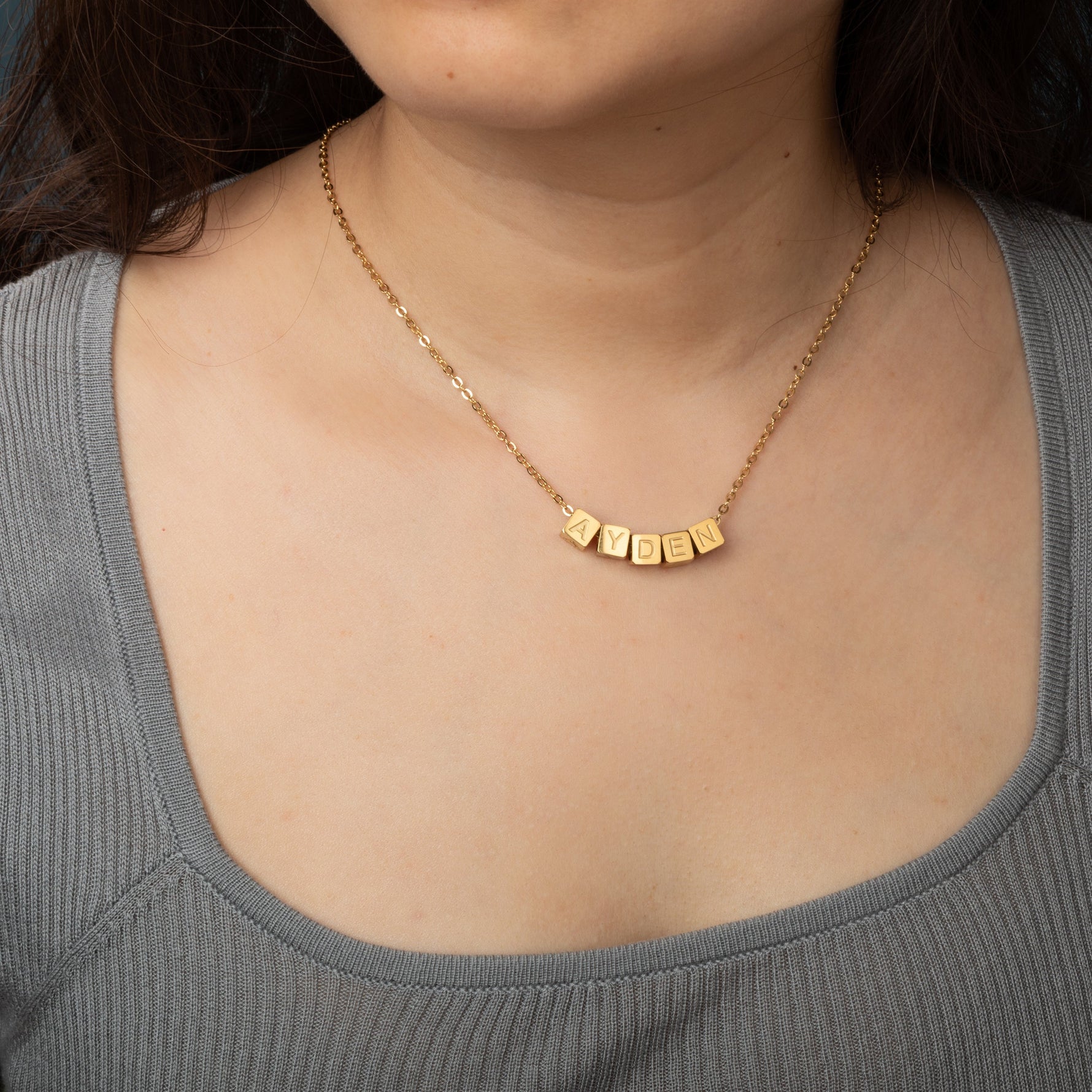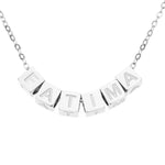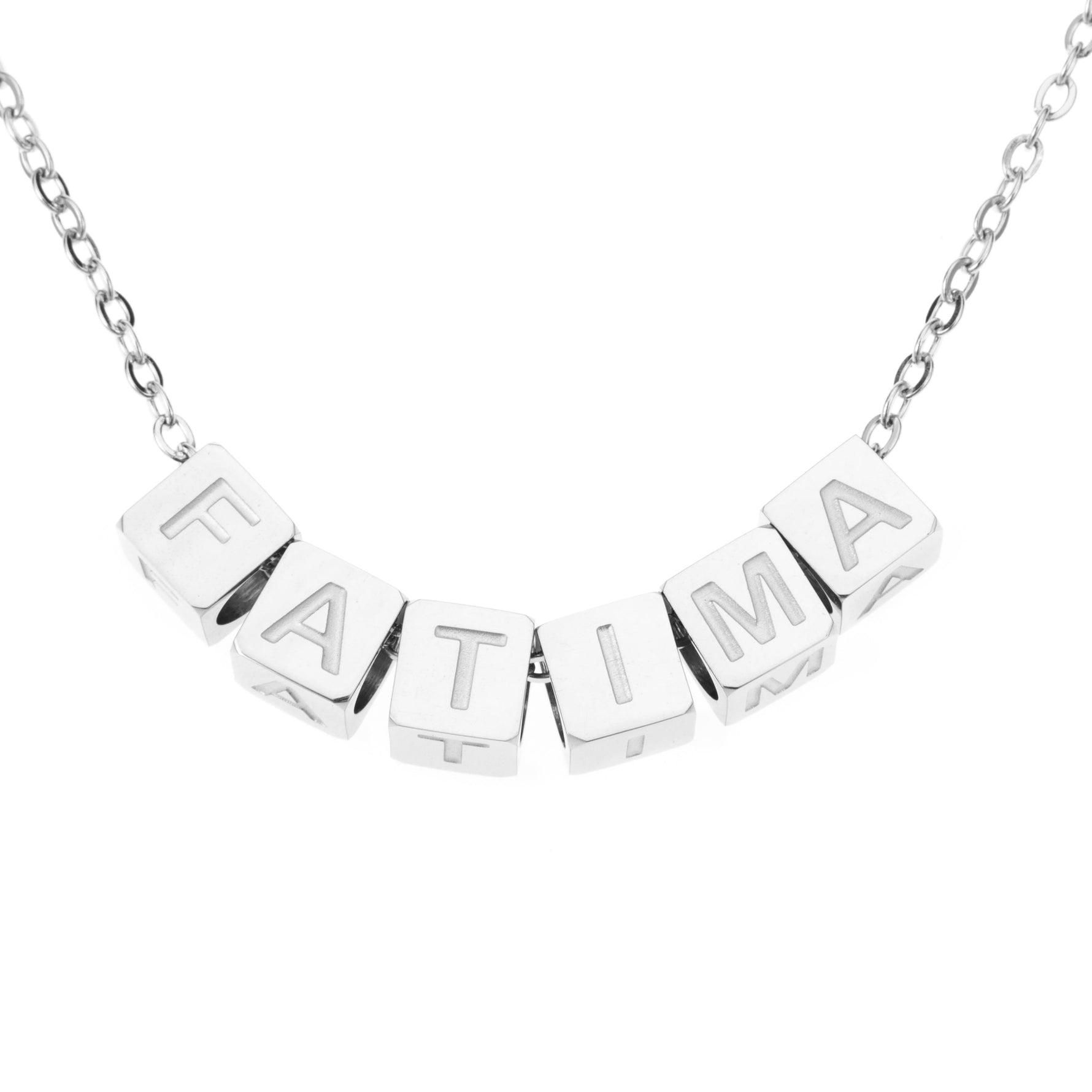El collar está disponible en acabado dorado, plateado o rosa, y se fabrica cuidadosamente a tu medida. Además, los dados giran de forma independiente a lo largo de la cadena, lo que te permite ocultar la palabra o el nombre cuando quieras darle un toque diferente a tu look.