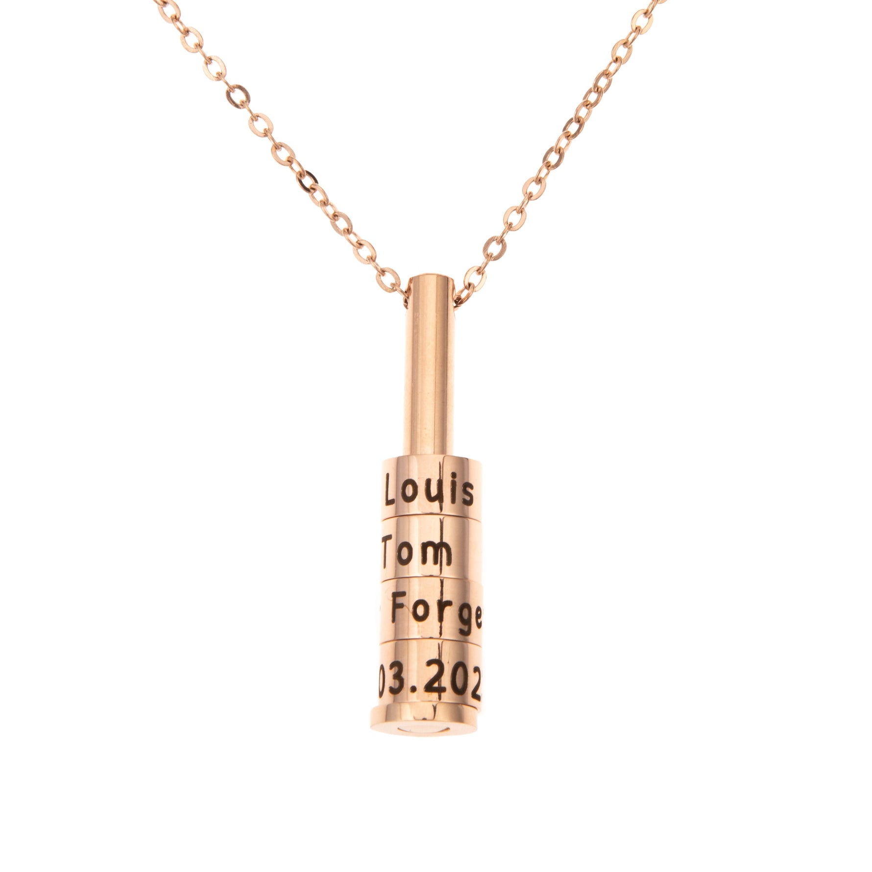 Este collar, elaborado especialmente y hecho a medida, está disponible en acero inoxidable dorado, plata u oro rosa. La cadena a juego se puede ajustar al largo deseado.