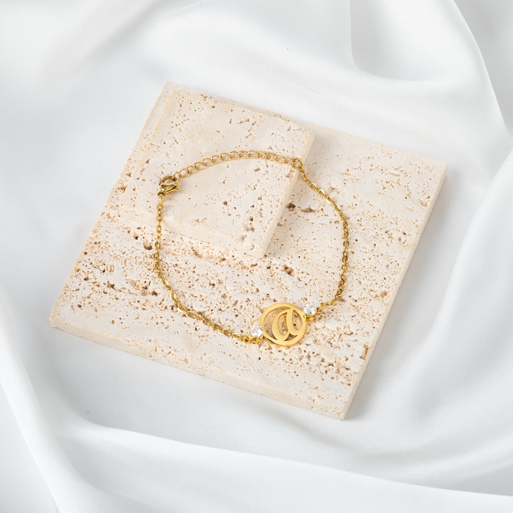 En el centro de esta pulsera se encuentra una inicial finamente tallada que simboliza una letra significativa para ti. Puede ser tu inicial, la de un ser querido o cualquier símbolo significativo. Rodeada por dos impresionantes piedras transparentes, irradia una gracia serena.