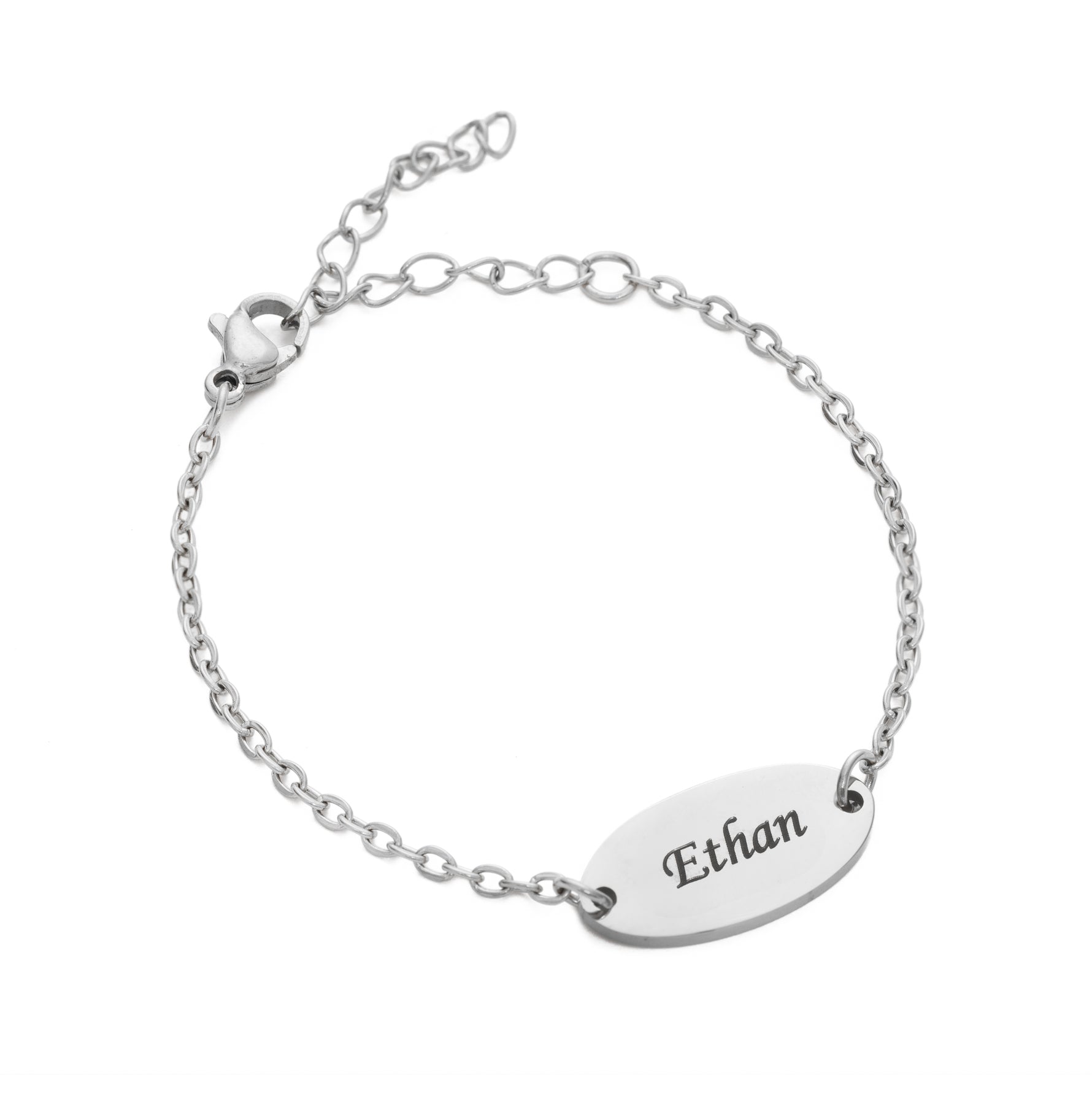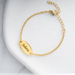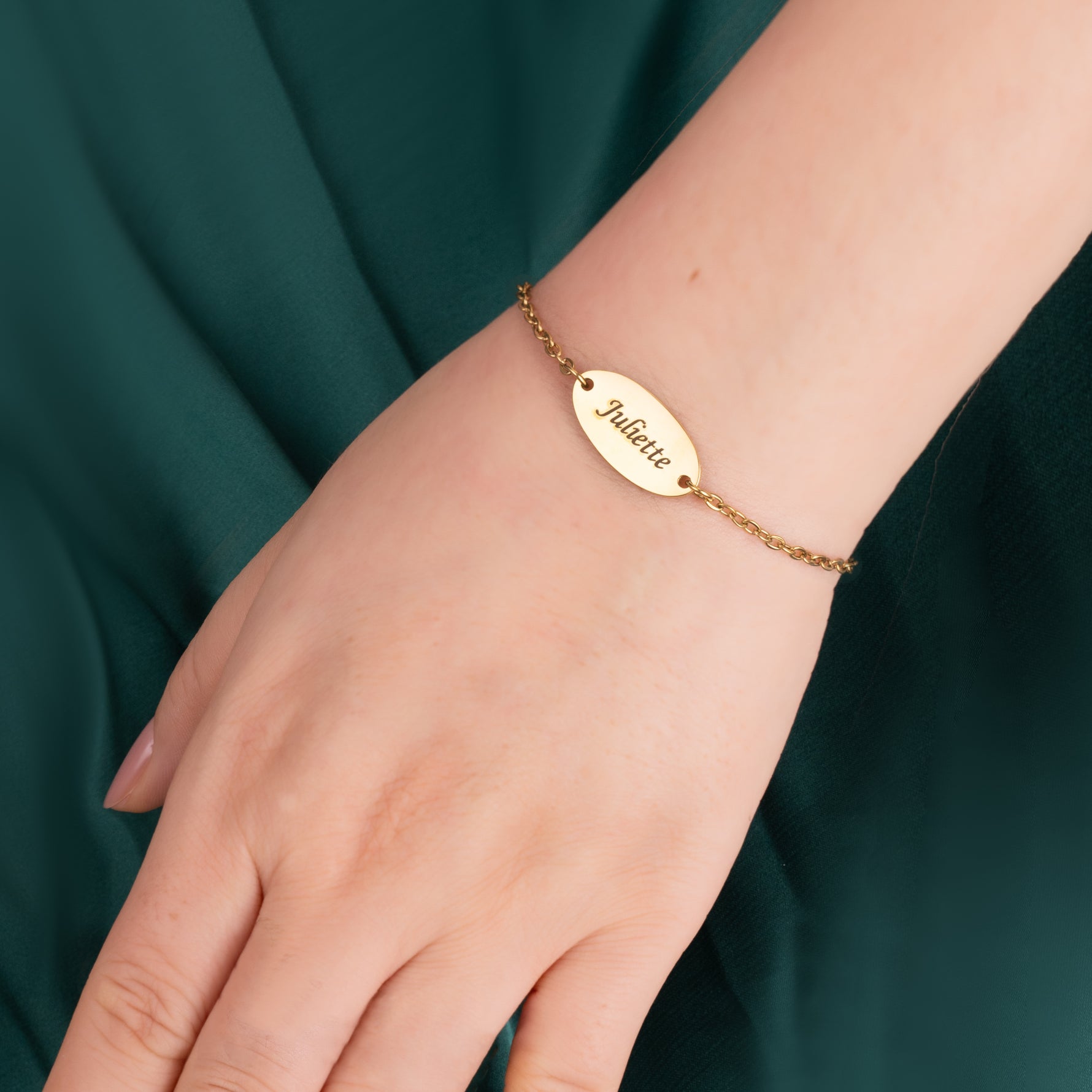 - Diseño delicado y atemporal : una placa de identificación grabada clásica en una delicada cadena .