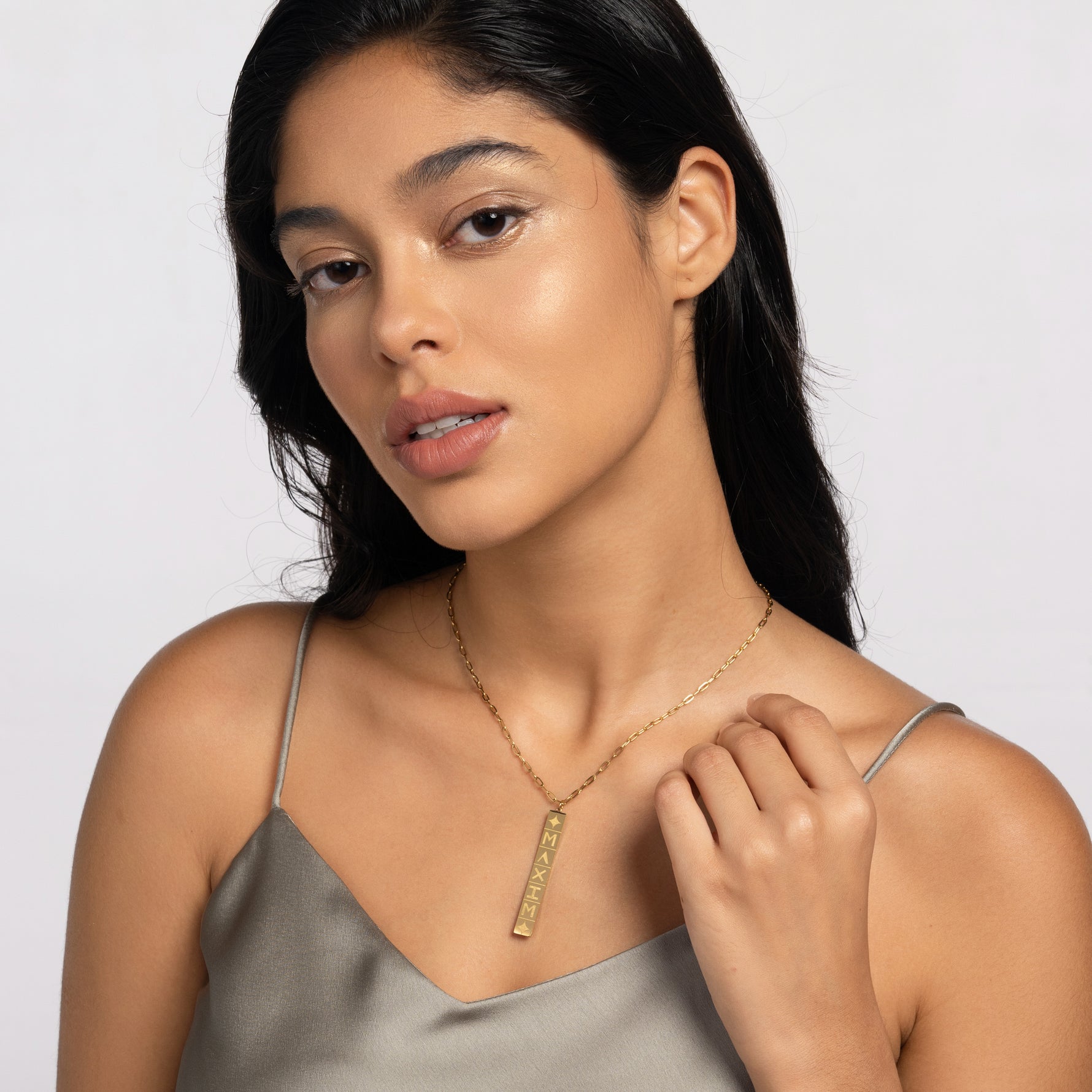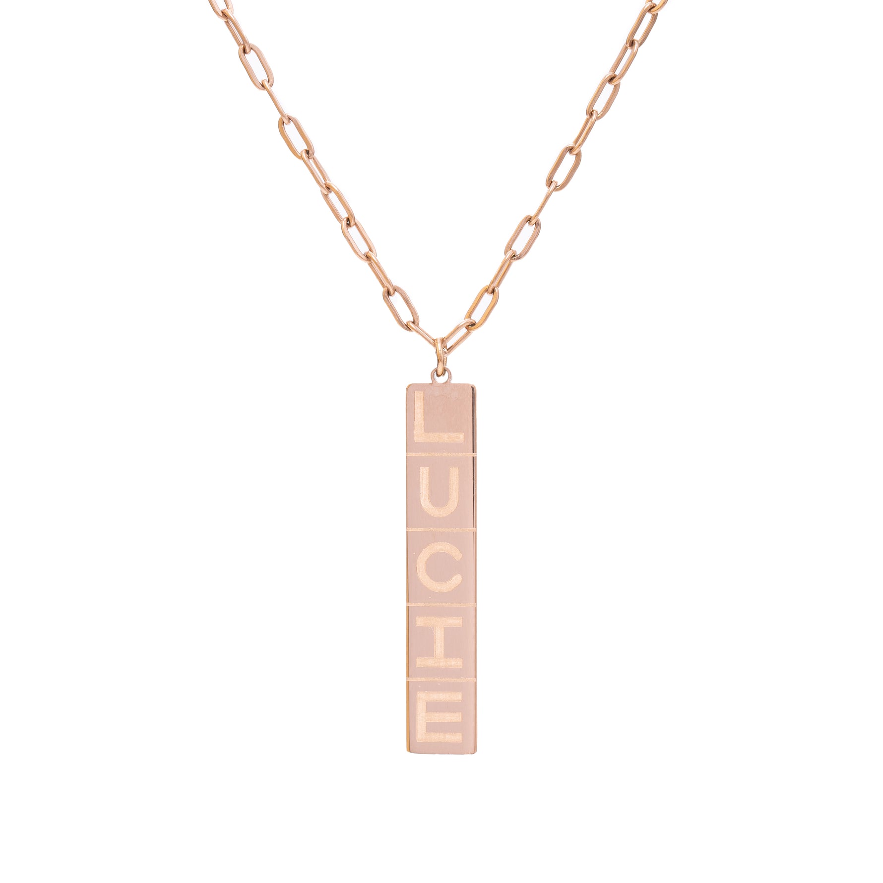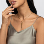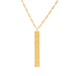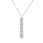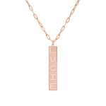 El collar con nombre Domino es una pieza contemporánea que encarna la elegancia en su forma más sencilla. Colgado de una delicada cadena, este colgante de barra vertical está disponible en oro, plata y oro rosa, ofreciendo el marco perfecto para personalizarlo con un nombre.
