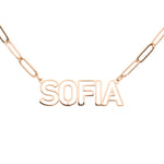 La combinación perfecta de audacia y elegancia . Presentamos nuestro collar personalizado, donde cada letra de tu nombre o texto elegido se presenta en mayúsculas caladas , revelando solo los contornos para un look a la vez audaz y sobrio. Cada letra tallada es una declaración, un grito sincero traducido en refinada elegancia.